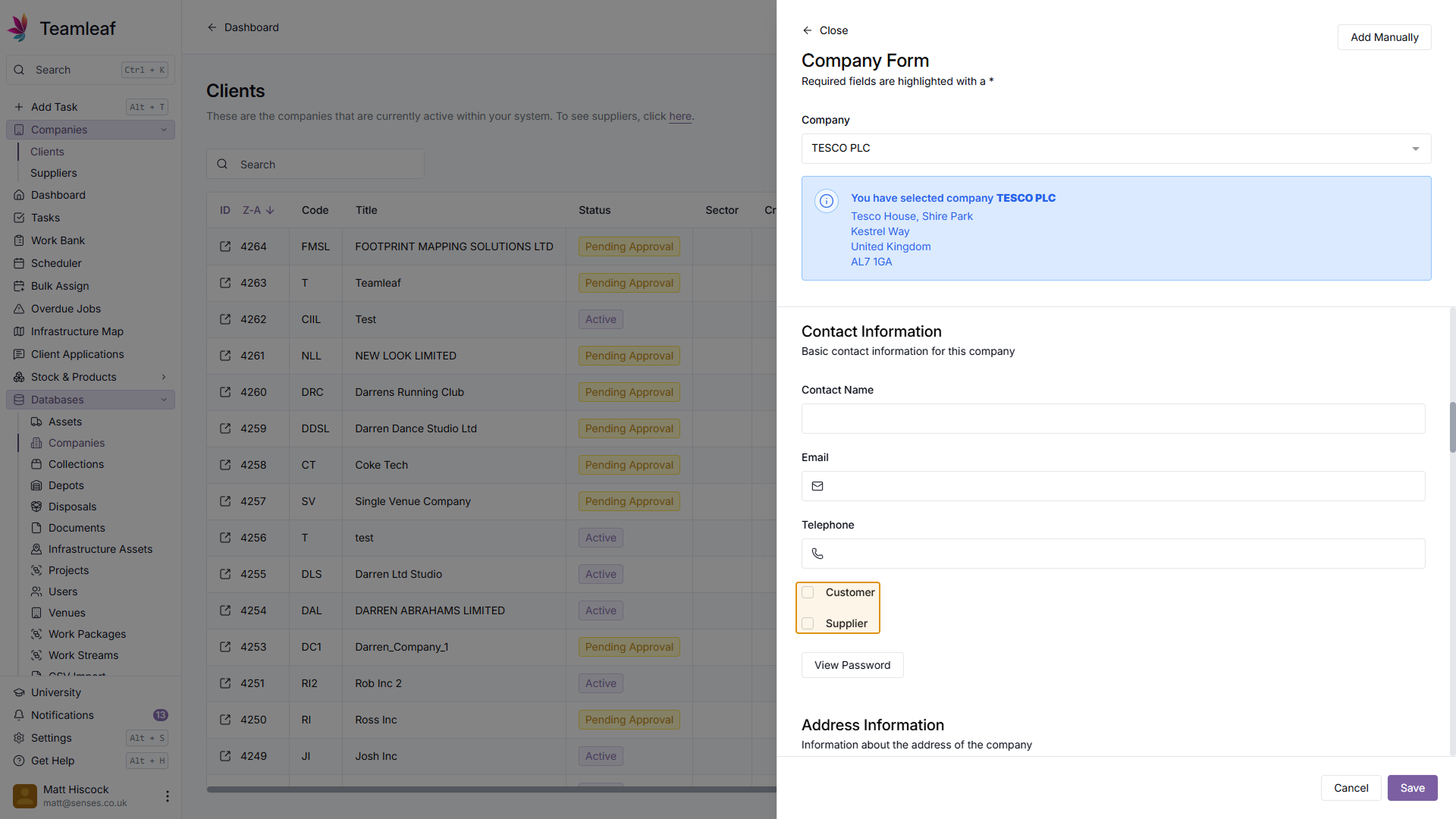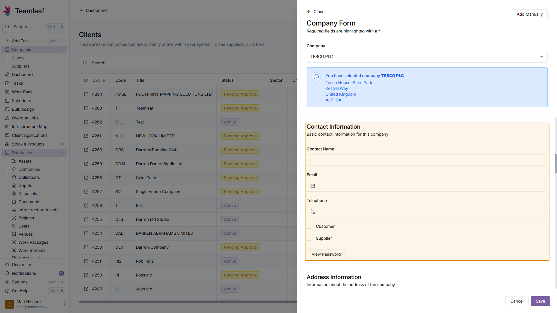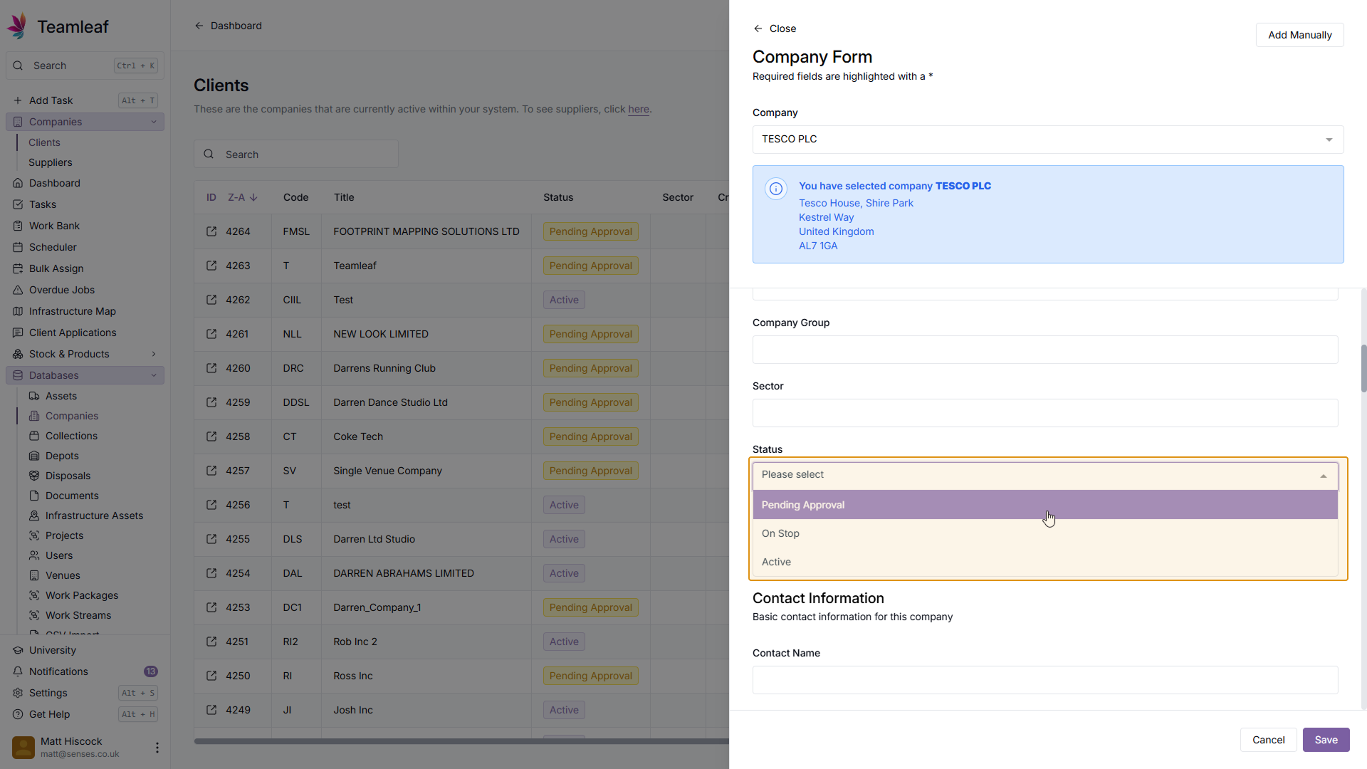 You can now begin entering further information about this Company. Add to (or edit) the Company Information section to begin. In this section, you can select the status for this company, so if it's still Pending approval, that can be marked here.