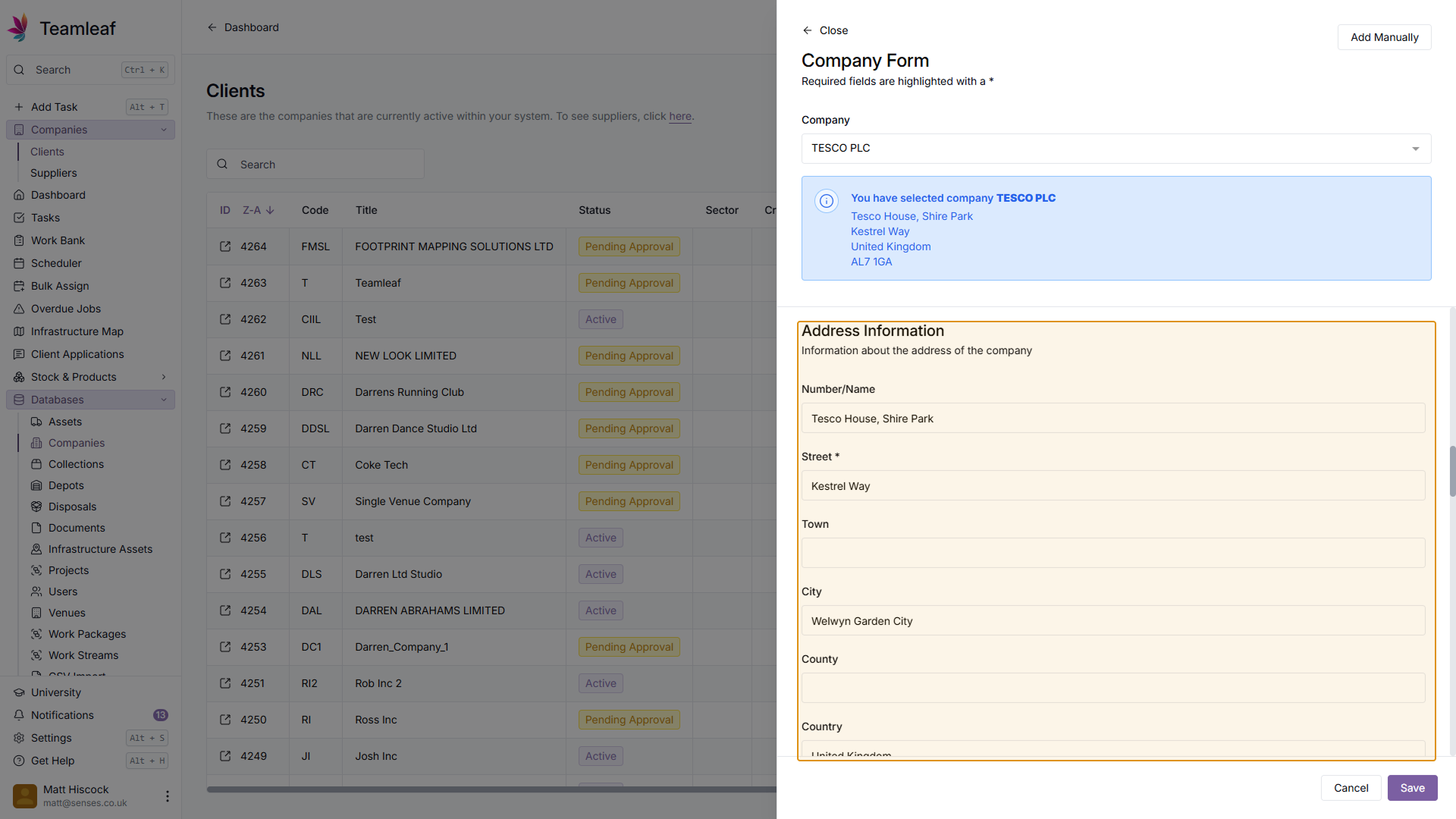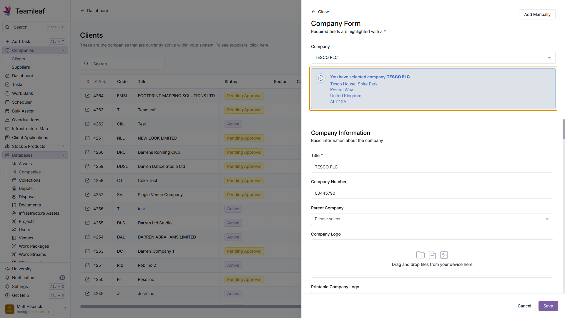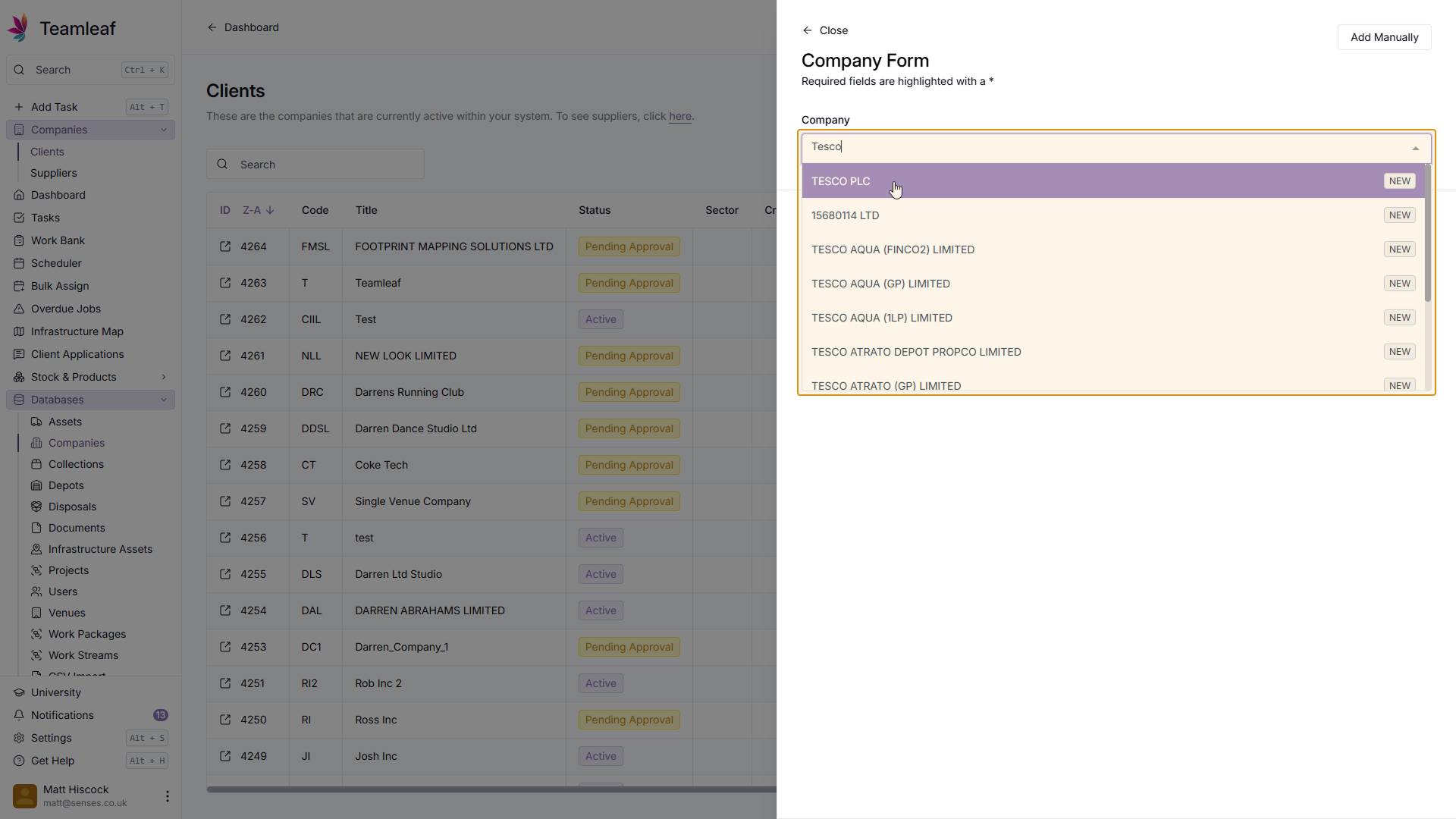 Next, in the company field, enter the name of the Company you'd like to add. Teamleaf will then automatically search companies house for that company, and pre-fill some of the company fields for you.