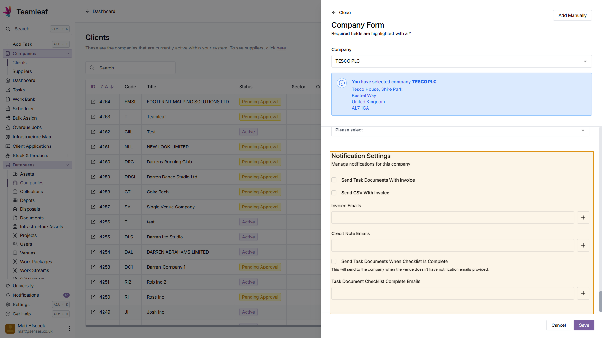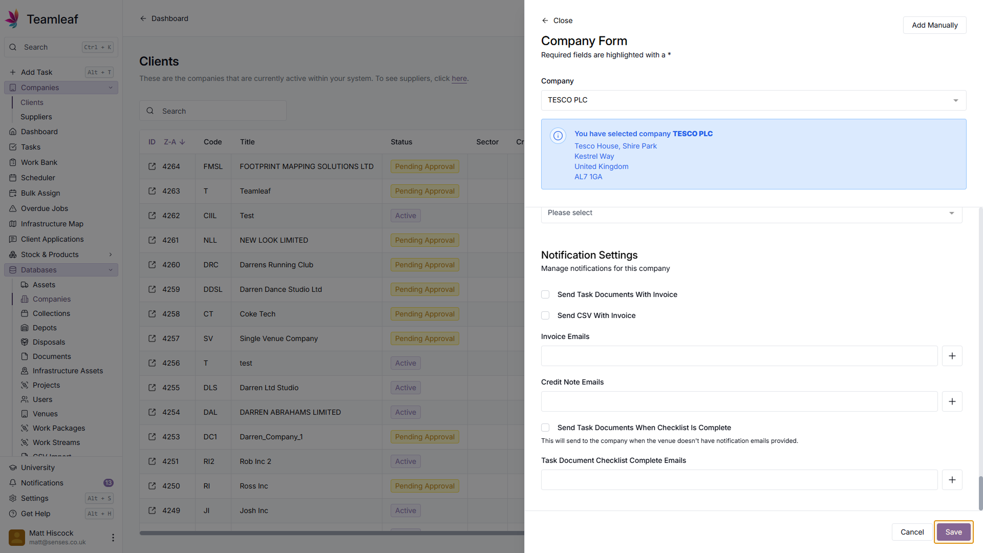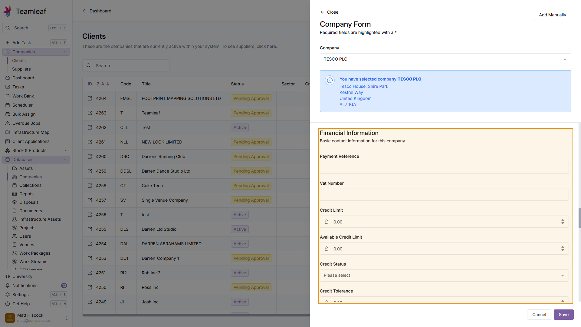 Next, in the company field, enter the name of the Company you'd like to add. Teamleaf will then automatically search companies house for that company, and pre-fill some of the company fields for you.