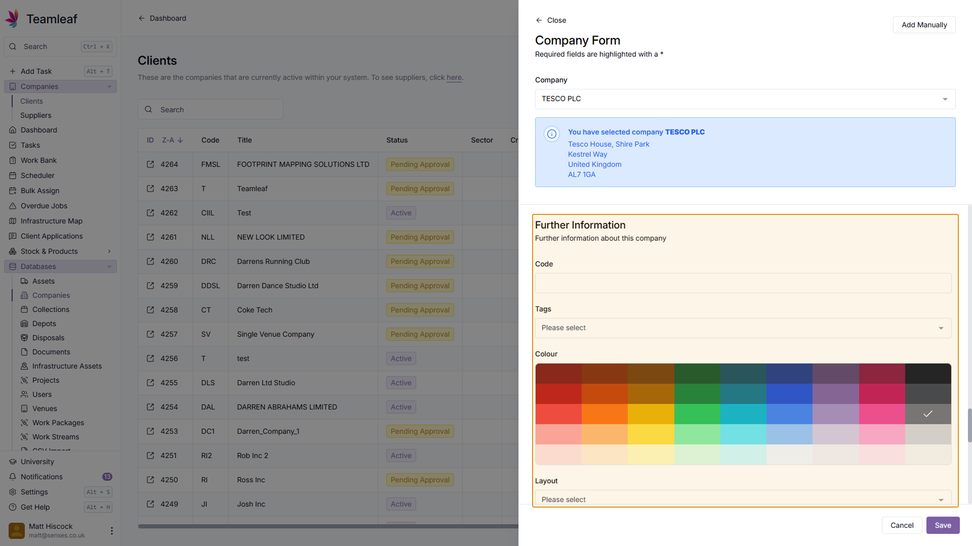 Next you can fill in the Further Information. Here, you can select the colour you'd like to represent this company across the system.