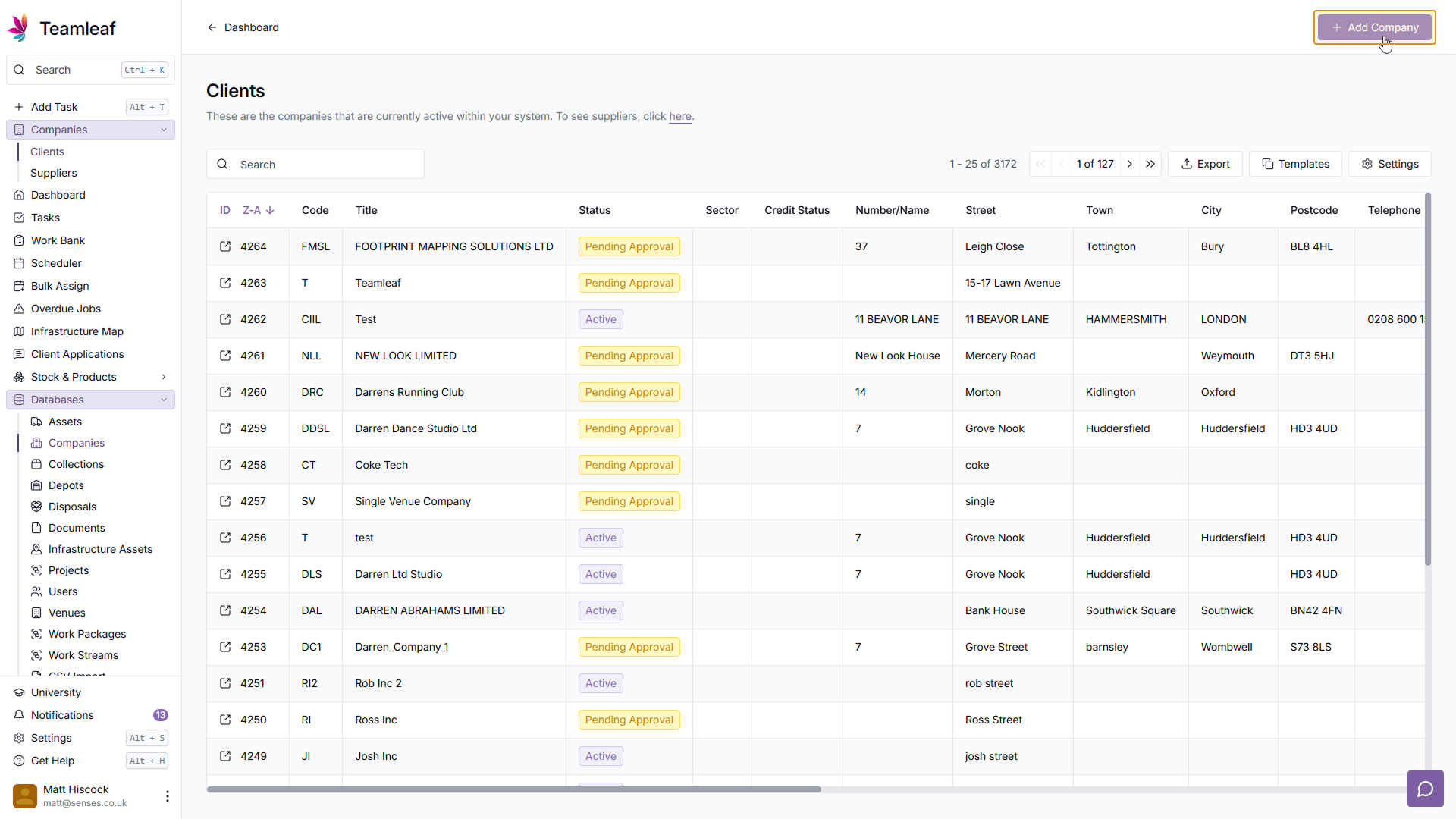 To start, go to the Companies page by click 'Databases' on the left sidebar, then going to 'Companies'