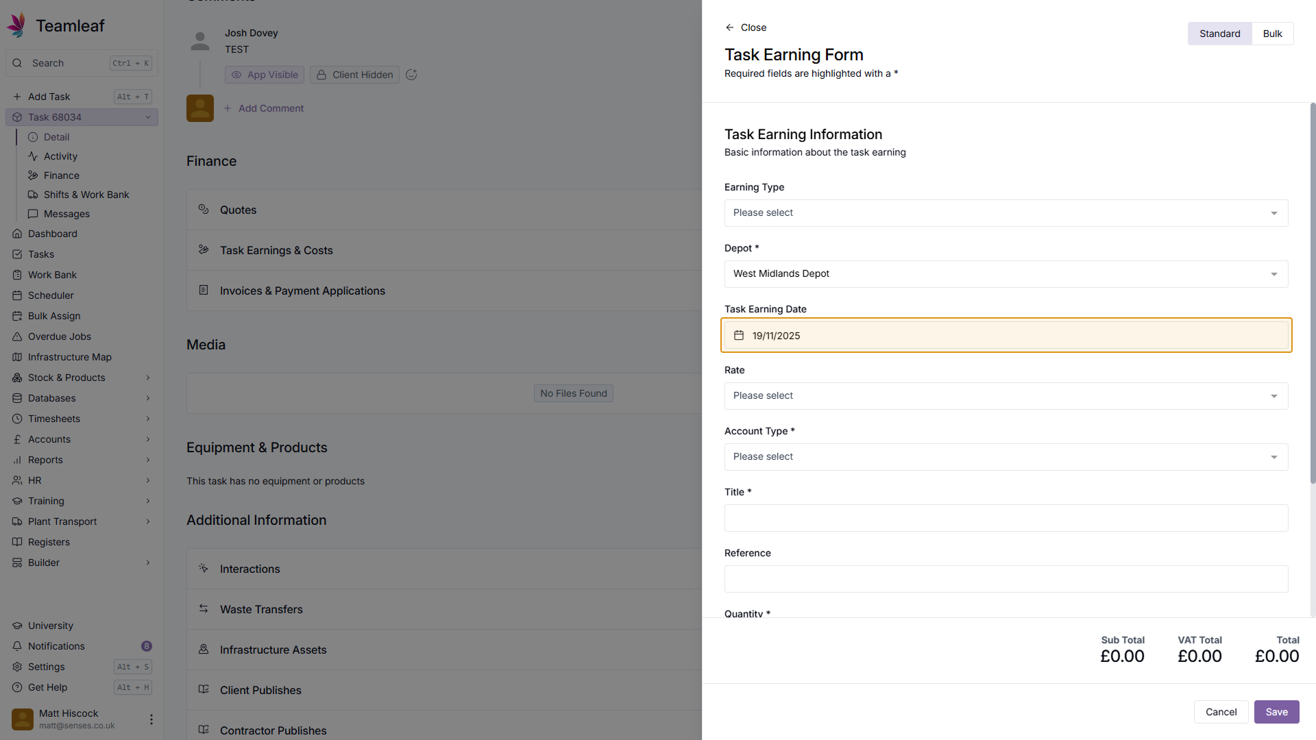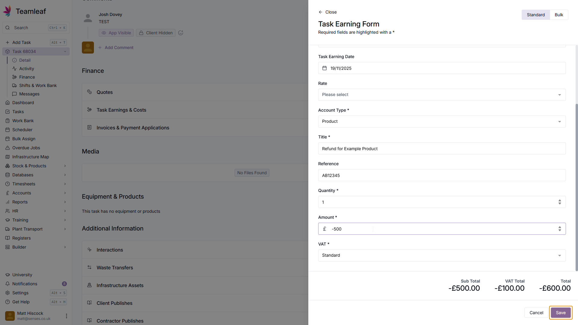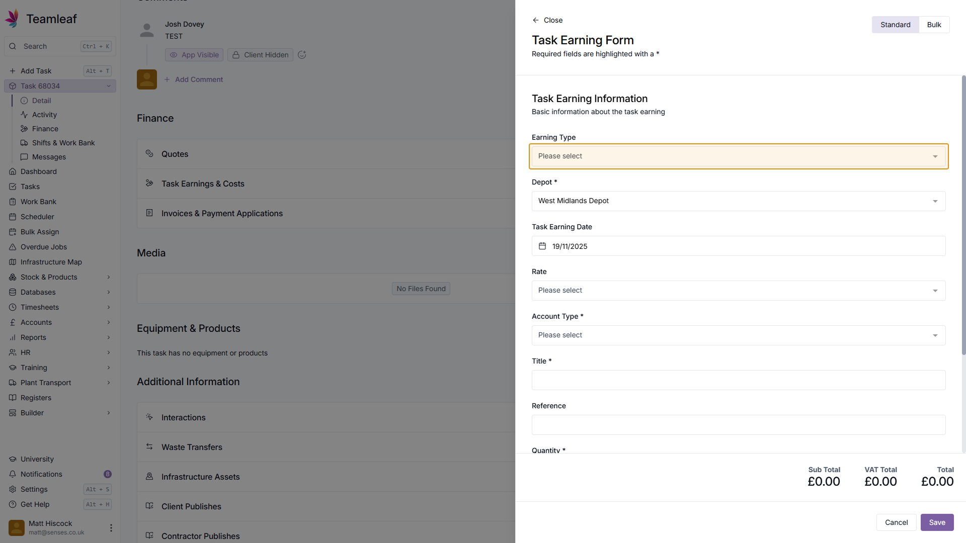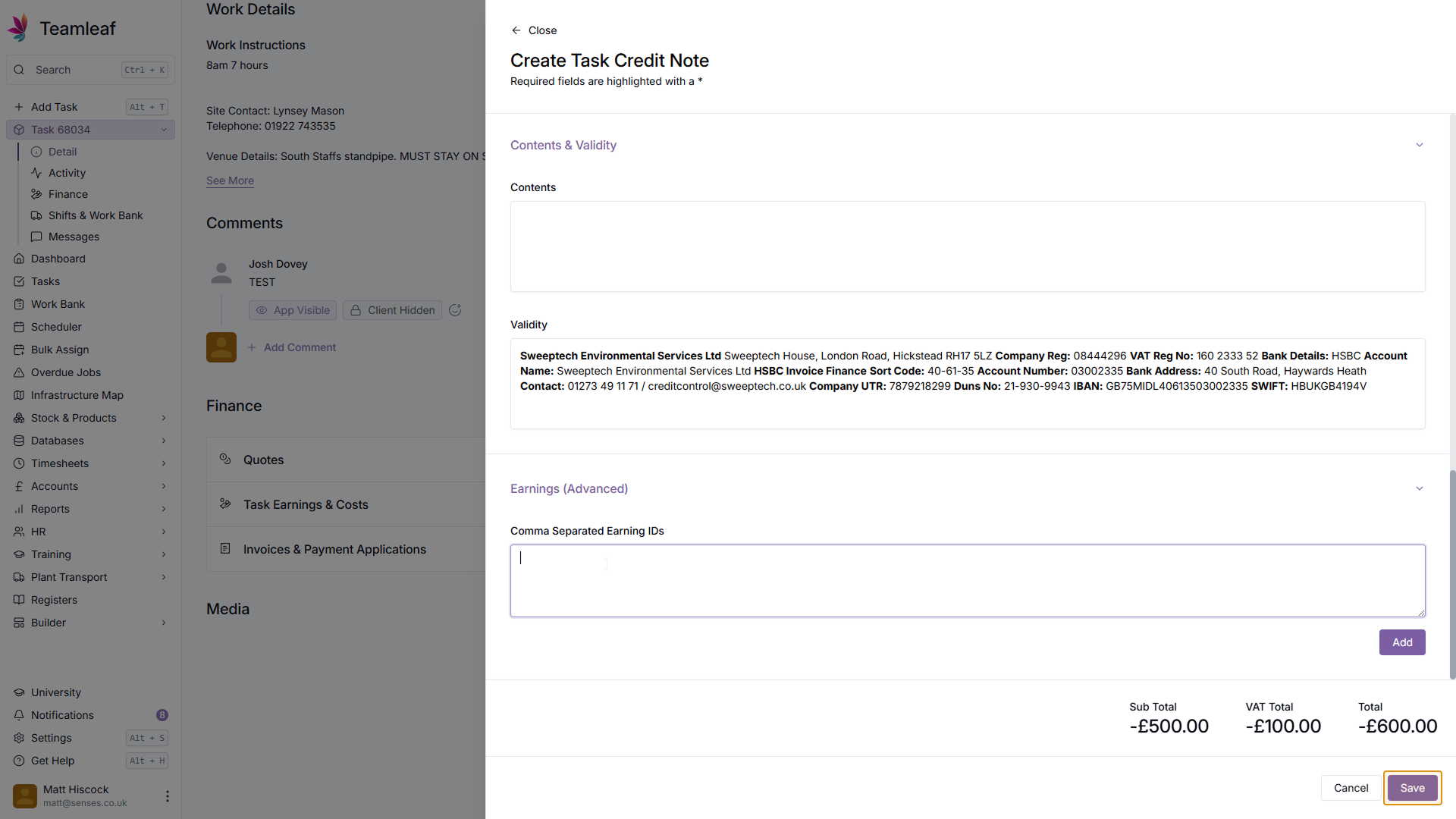 Once you're happy with the Task Earning, click 'Save' in the bottom right. The Task Earning will now be added to the 'Task Earnings & Costs' section of the Task