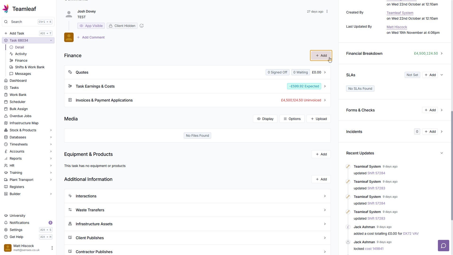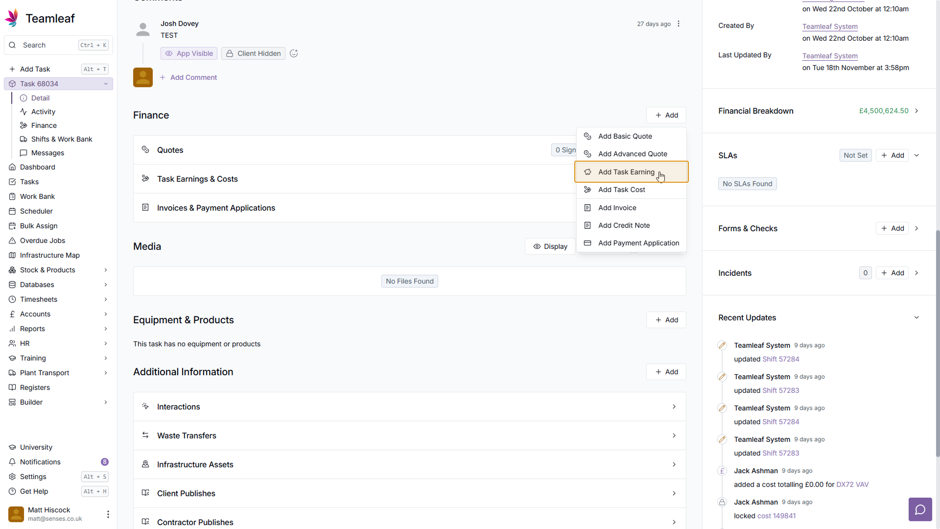 Next, scroll down to the finance section, and click 'Add', in the dropdown menu that opens, click 'Add Task Earning'