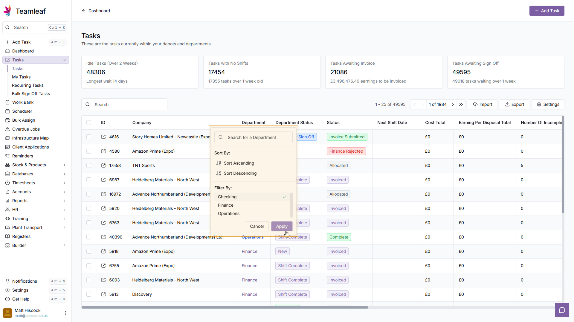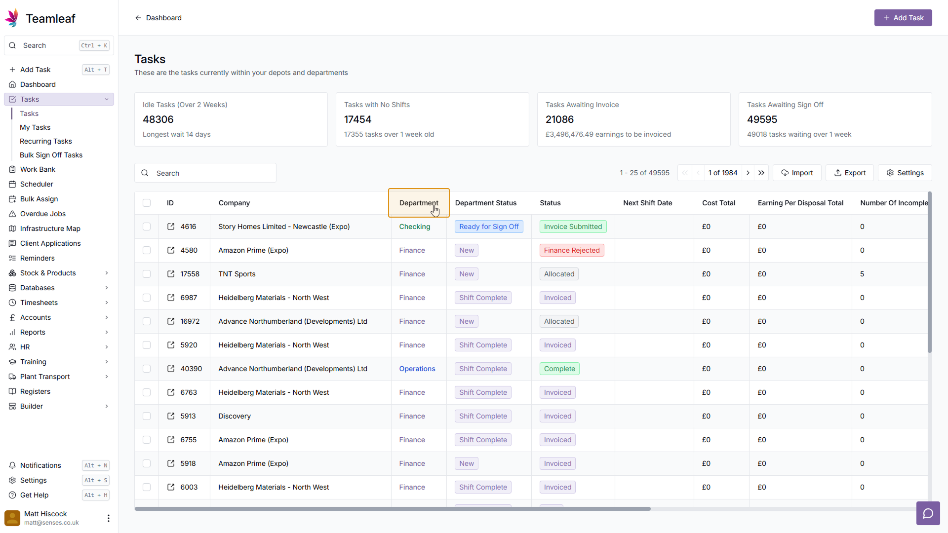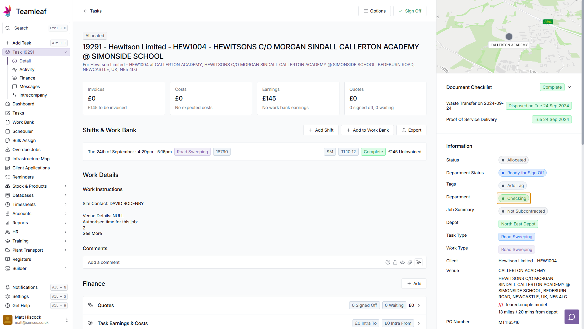 Now you are on the Task page, you can see which Department this task is currently on, by looking at the 'Information' section at the right of the page. After signing this task off, the Department will change.