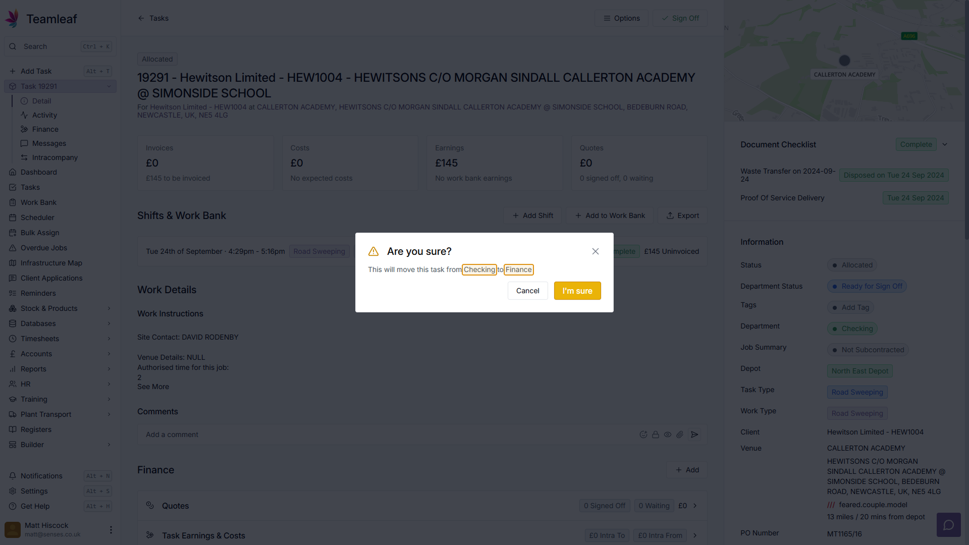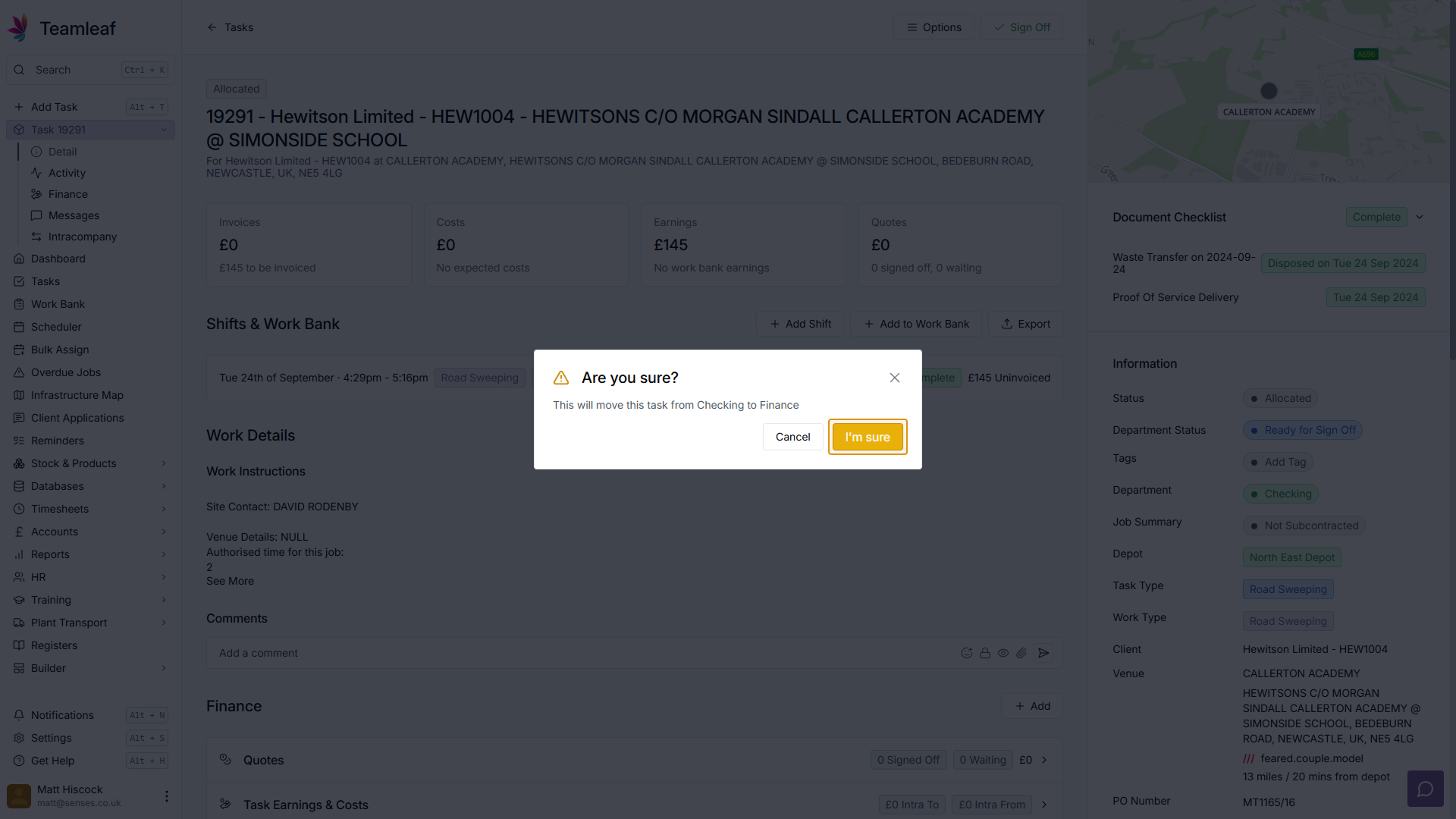 A popup will then appear with information about the Sign Off. Here you will see which department the task is currently on, and which department it will be moved to after it has been signed off. Clicking the "I'm Sure" button in the bottom right of the popup will then make this change.